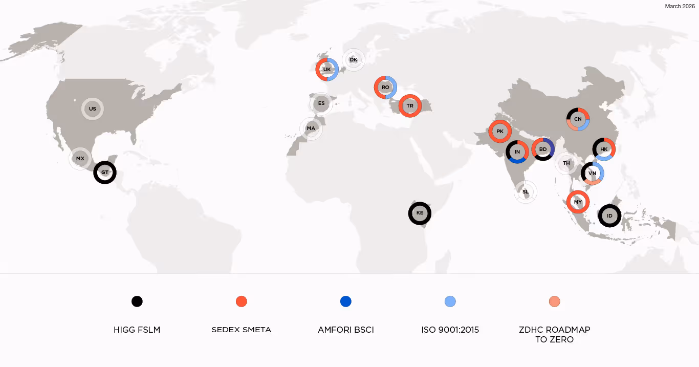 As a key part of the supply chain, we believe that being on top of our compliance is vital. Thanks to ProductDNA®, we can monitor ESG compliance across our production sites, a continuing process in which we strive to protect the health, safety, and rights of our employees, community, and the environment in which they operate. To do so, we rely on social compliance standards that authenticate that international and local labor rights are respected, such as amfori BSCI, Sedex SMETA, and Higg FEM.