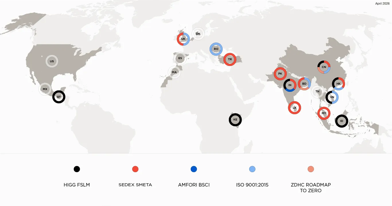 As a key part of the supply chain, we believe that being on top of our compliance is vital. Thanks to ProductDNA®, we can monitor ESG compliance across our production sites, a continuing process in which we strive to protect the health, safety, and rights of our employees, community, and the environment in which they operate. To do so, we rely on social compliance standards that authenticate that international and local labor rights are respected, such as amfori BSCI, Sedex SMETA, and Higg FEM.